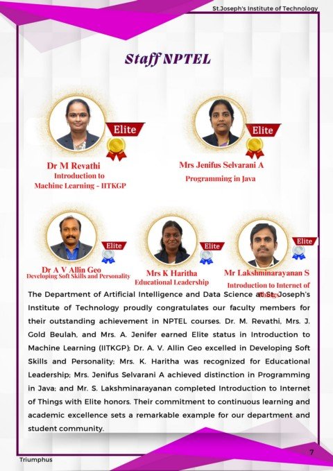 their outstanding achievement in NPTEL courses. Dr. M. Revathi, Mrs. J.